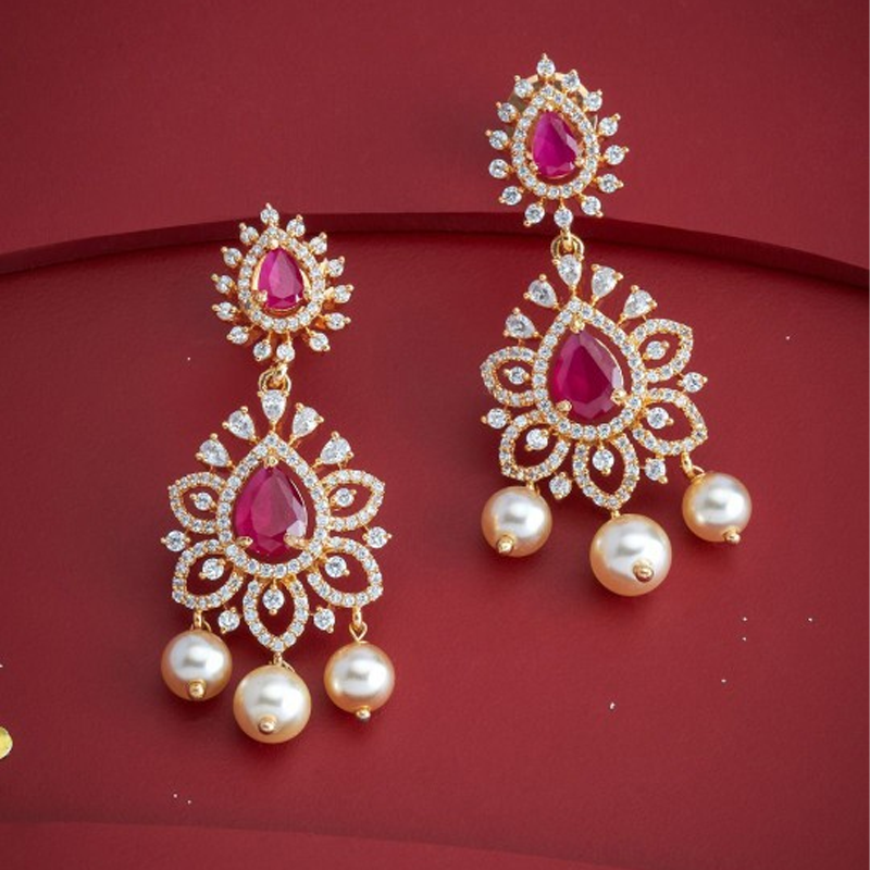 Gold-Plated Zircon Studded & Pearls Beaded Drop Earrings
